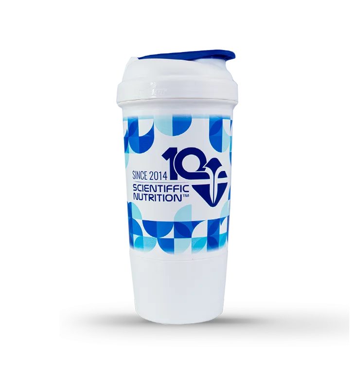 Mezclador de proteínas del 10 Aniversario de Scientiffic Nutricion. Con un dosificador para tu segunda dosis y un diseño especial.