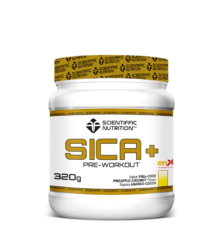 SICA + es un potente Pre – Workout de liberación sostenida y con efecto saciante. 320g – Sabor Piña Coco.